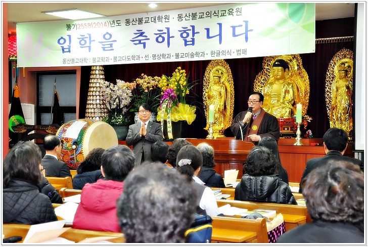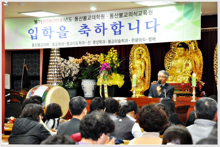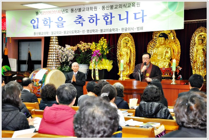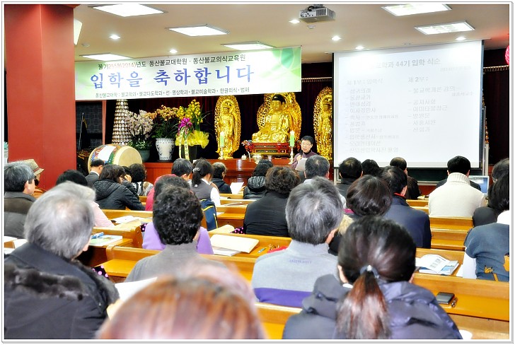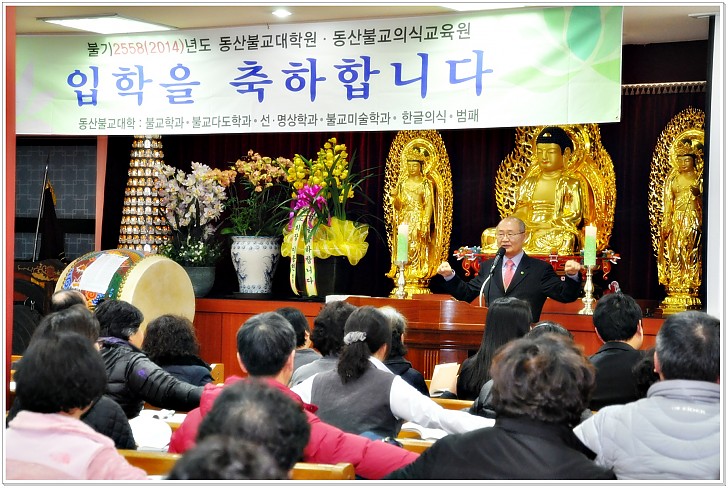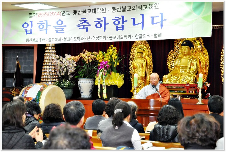 환영인사-이상우 이사장, 축사-안동일 명예이사장, 법어-법산 학장스님, 입학생선서-임광용 신입생